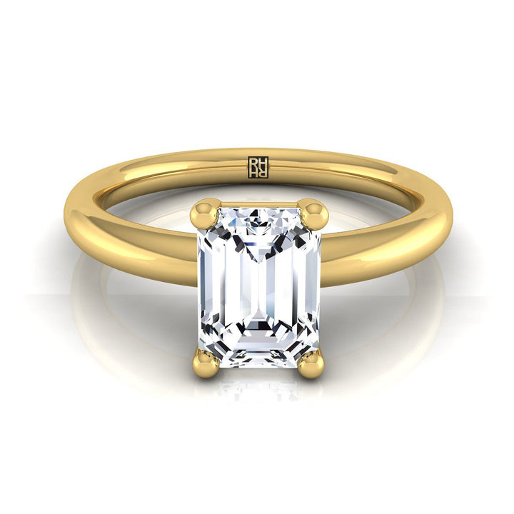 คลาสสิกและสง่างาม แหวนหมั้นเพชรทรงเอเมอรัลด์คัตนี้มีการตั้งเม็ดเพชรแบบ 4 กรงเล็บ พร้อมก้านแหวนโค้งมนในทองคำเหลือง 18 กะรัต