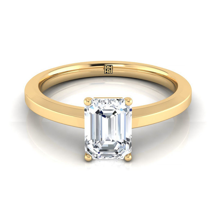 แหวนหมั้นเพชรทรงเอเมอรัลด์คัตสไตล์โมเดิร์นนี้โดดเด่นด้วยขอบเอียงและแหวนที่สวมใส่สบายในทองคำ 18 กะรัตสีเหลือง