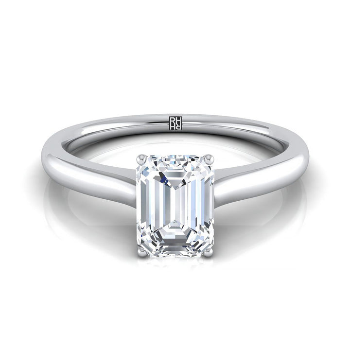 ความสง่างามที่เรียบง่าย แหวนหมั้นเพชรทรงเอเมอรัลด์คัตนี้นำเสนอการออกแบบเพชรแบบติดตั้งในกรอบพร้อมกับการตกแต่งผิวมันเงาคลาสสิกในแพลทินัม