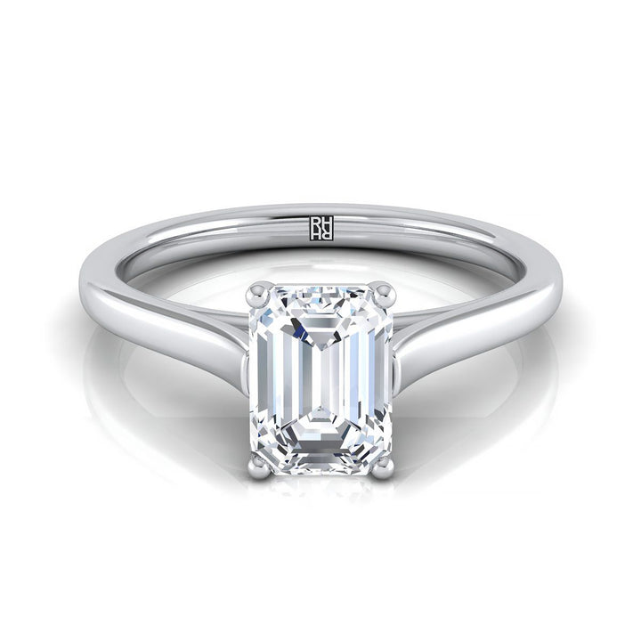 แหวนหมั้นแบบโซลิแทร์เจียระไนทรงมรกตสุดคลาสสิกนี้ โชว์ขอบแหวนทรงสี่เหลี่ยมและการตั้งแบบวิหารในทองคำขาว 18 กะรัต