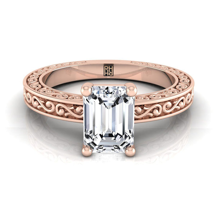 ความสง่างามที่เรียบง่าย แหวนหมั้นเพชรทรงเอมเมอรัลด์นี้มีการออกแบบสลักลายเกลียวบนตัวแหวน พร้อมการขัดเงาแบบคลาสสิกในทองกุหลาบ 14k