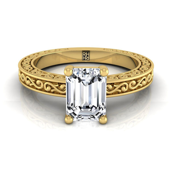 ความสง่างามที่เรียบง่าย แหวนหมั้นเพชรทรงเอเมอรัลด์คัตนี้แสดงให้เห็นถึงลวดลายสลักแบบม้วนบนก้านแหวน พร้อมด้วยการขัดเงาสูงแบบคลาสสิกในทองคำเหลือง 14 กะรัต