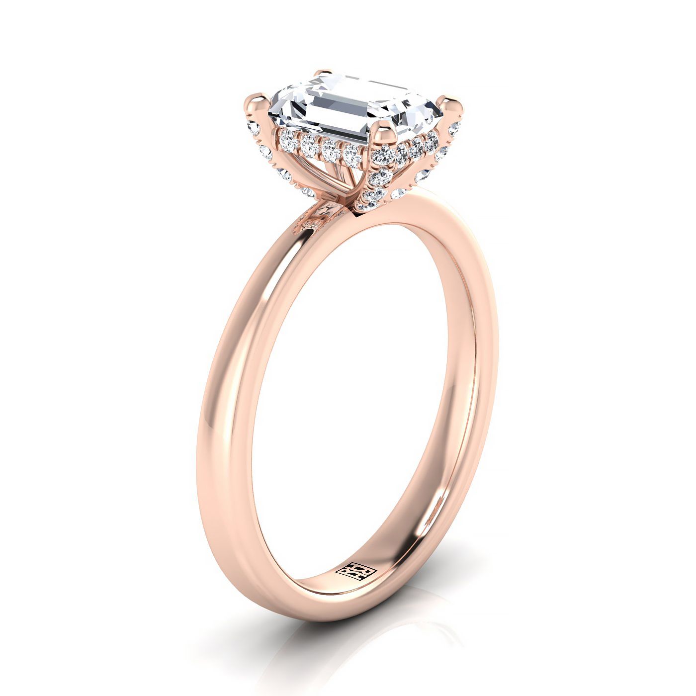 แหวนหมั้นเดี่ยวทองคำชมพู 14K ประดับเพชรทรงเอมเมอรัลด์และกรงเล็บ พร้อมฮาโล่ลับ -1/10ctw