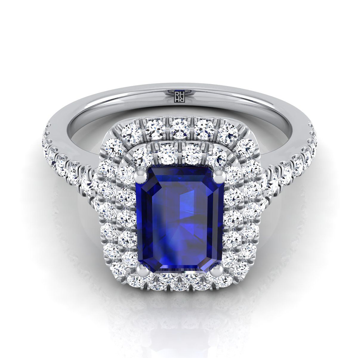 แหวนหมั้นทองคำขาว 18K ประดับไพลินเจียระไนทรงสี่เหลี่ยมมรกต พร้อมวงแหวนเพชรแบบสกัลลอปด์และพาเว่ - 1/2ctw