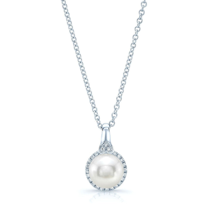 จี้ทองคำขาว 14 กะรัต มุกน้ำจืดขนาด 8.50 มม. เพชรทรงกลมเจียระไนแบบ Brilliant 24 เม็ด รวม 1/6 กะรัต สร้อยคอแบบบิดเกลียวยาว 17 นิ้ว