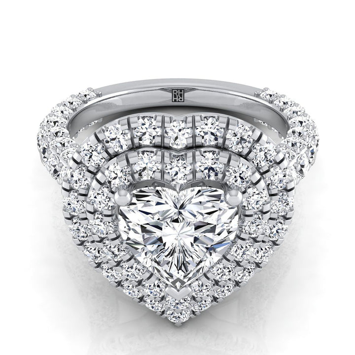 แหวนหมั้นทองคำขาว 14K รูปหัวใจ ประดับเพชรกลางแบบหนาและหรูหราพร้อมฮาโลคู่แบบฝรั่งเศสฝังเพชร - 2ctw