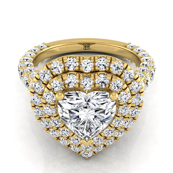 แหวนหมั้นทองคำเหลือง 18K รูปหัวใจ ประดับเพชรกลางแบบหนาและหรูหราพร้อมฮาโลคู่แบบฝรั่งเศสปาเว่ - 2 กะรัตรวม