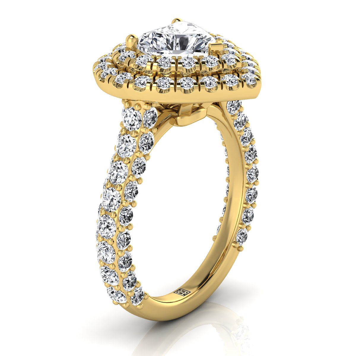 แสดงสไตล์อย่างสง่างาม แหวนหมั้นรูปหัวใจแบบดับเบิลฮาโลนี้นำเสนอเพชรเจียระไนแบบบริลเลียนต์คัท (h-i/vs 2.15ctw) พร้อมกับแถบเพชรแบบเพฟที่ประณีต ติดตั้งในตัวเรือนทองคำเหลือง 18k