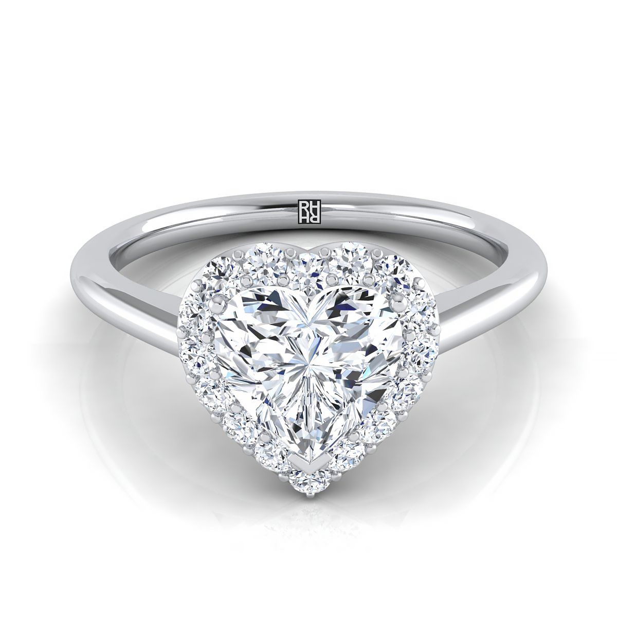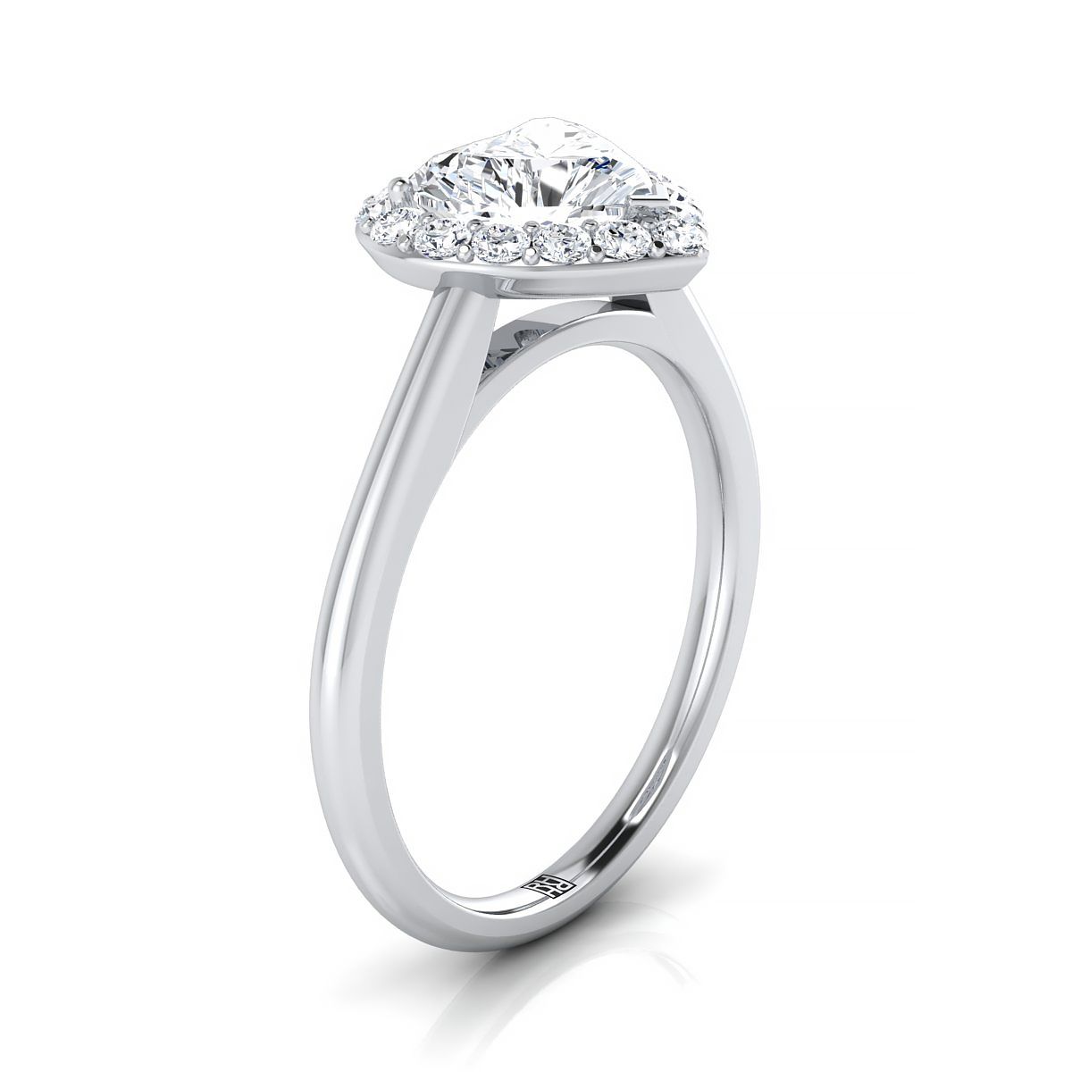 แหวนหมั้นรูปหัวใจแบบฮาโลที่มีสไตล์คลาสสิกนี้ โชว์เพชรเจียระไนแบบ Brilliant Cut (h-i/vs 0.20 Ctw) ที่ประดับอย่างสวยงามในตัวเรือนทองคำขาว 18 กะรัตแบบคลาสสิก