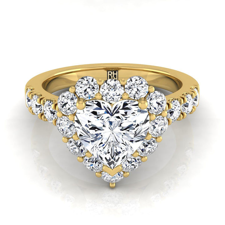 แสดงออกถึงสไตล์ที่สง่างาม แหวนหมั้นรูปหัวใจแบบฮาโลที่ประดับด้วยเพชรเจียระไนแบบ Brilliant Cut (h-i/vs 1.00ctw) ที่ประดับอย่างสวยงามในตัวเรือนทองคำเหลือง 18k คลาสสิก