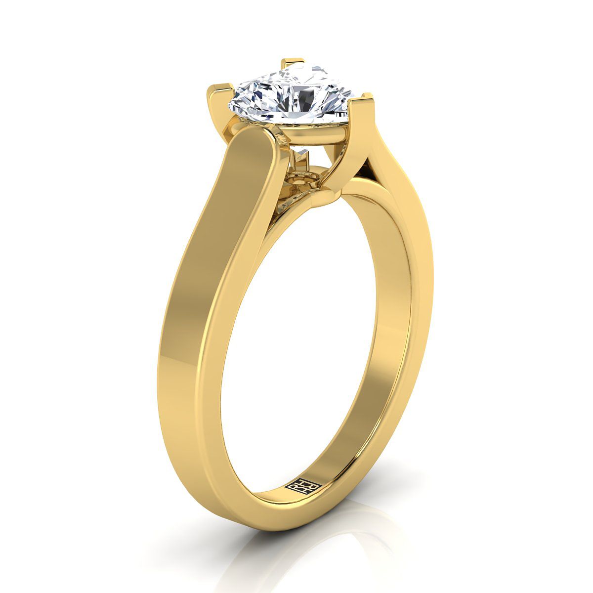 ความสง่างามที่เรียบง่าย แหวนหมั้นเพชรรูปหัวใจนี้นำเสนอการตั้งศูนย์แบบวิหารพร้อมขอบแบนขัดเงาสูงในทองคำเหลือง 14 กะรัต