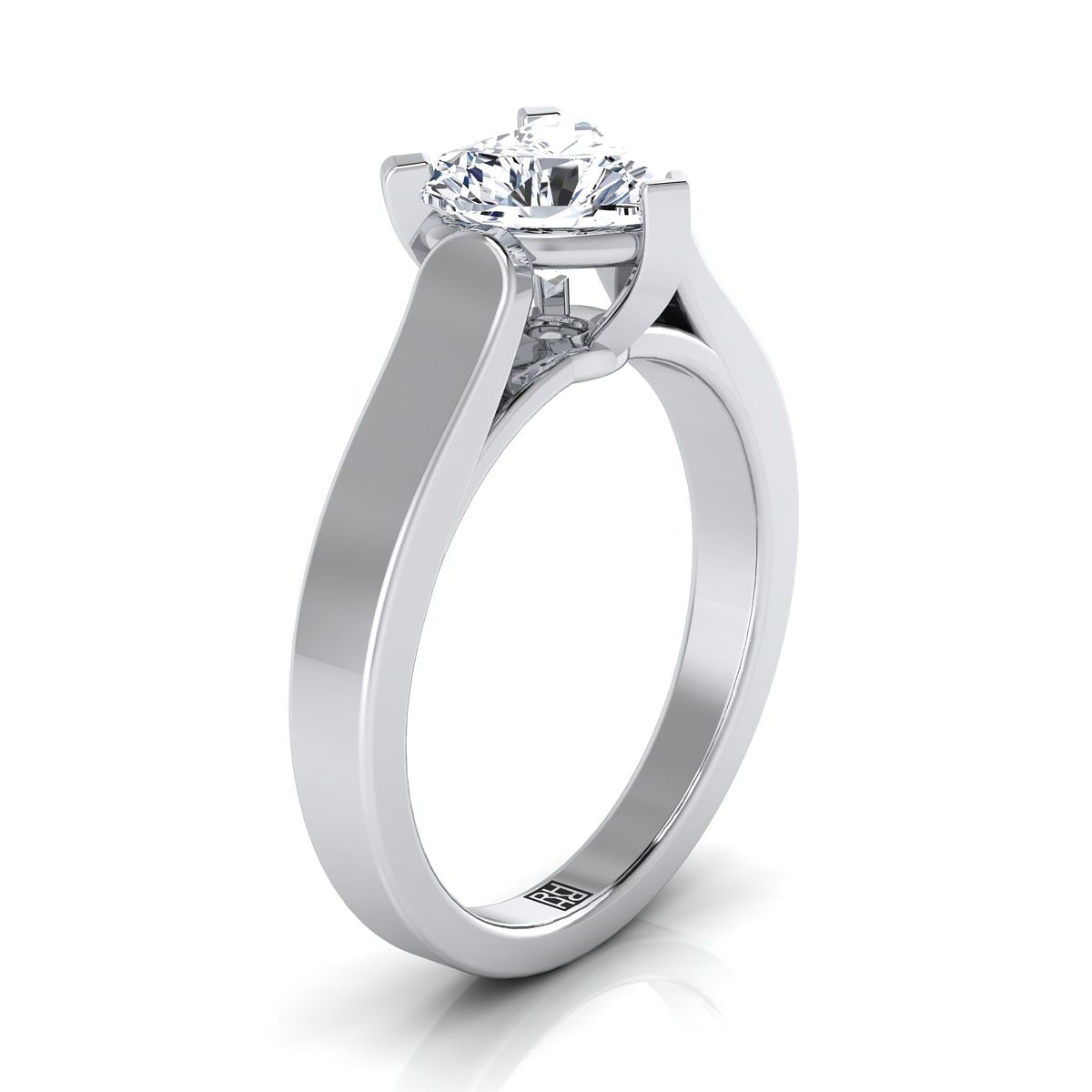 ความสง่างามที่เรียบง่าย แหวนหมั้นเพชรรูปหัวใจนี้นำเสนอการตั้งศูนย์แบบวิหารพร้อมขอบแบนขัดเงาสูงในทองคำขาว 18 กะรัต