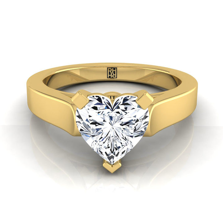 ความสง่างามที่เรียบง่าย แหวนหมั้นเพชรรูปหัวใจนี้นำเสนอการตั้งศูนย์แบบวิหารพร้อมขอบแบนขัดเงาสูงในทองคำเหลือง 18 กะรัต