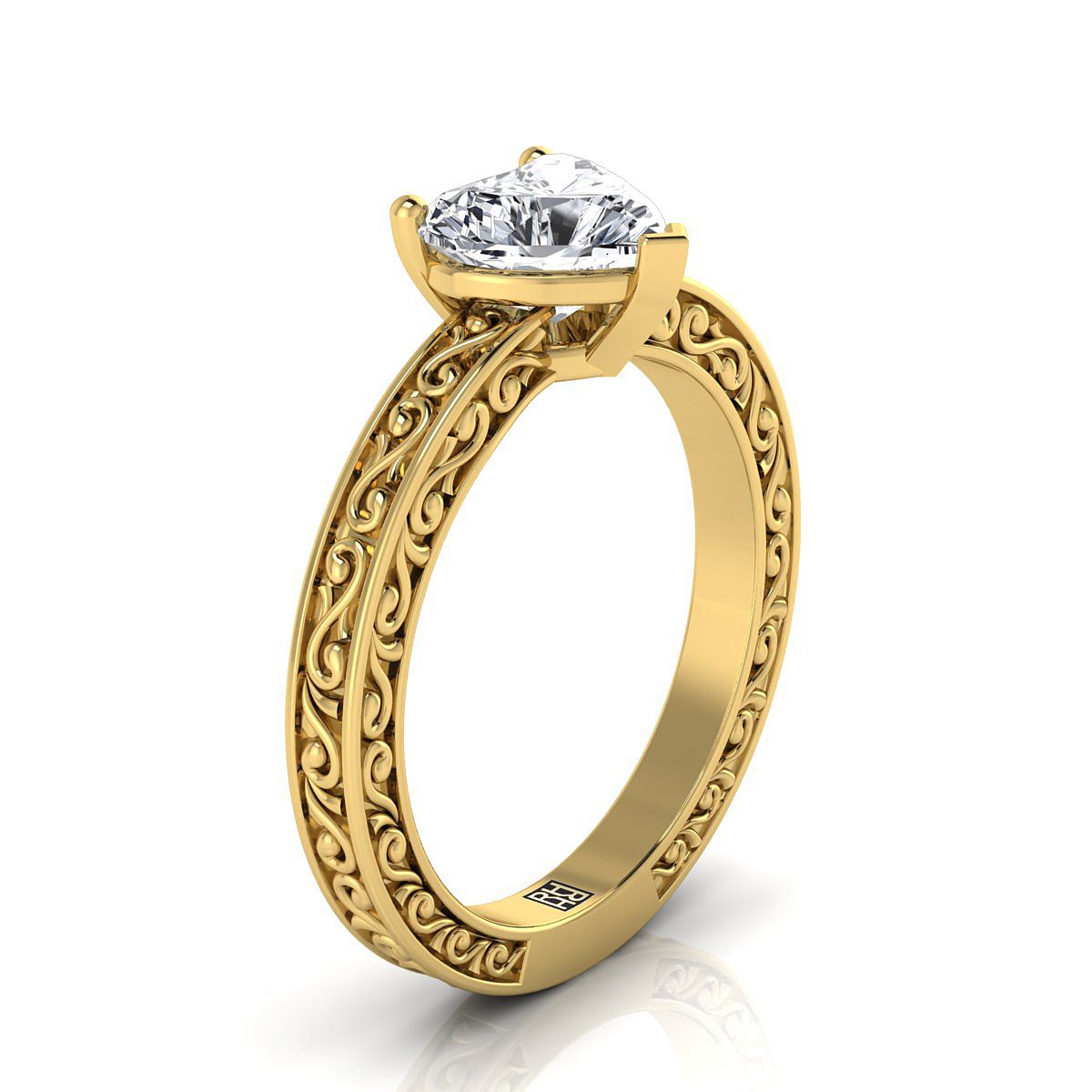 ความสง่างามที่เรียบง่าย แหวนหมั้นเพชรรูปหัวใจนี้แสดงลวดลายสลักแบบม้วนบนก้านแหวนพร้อมการขัดเงาสูงแบบคลาสสิกในทองคำเหลือง 18 กะรัต