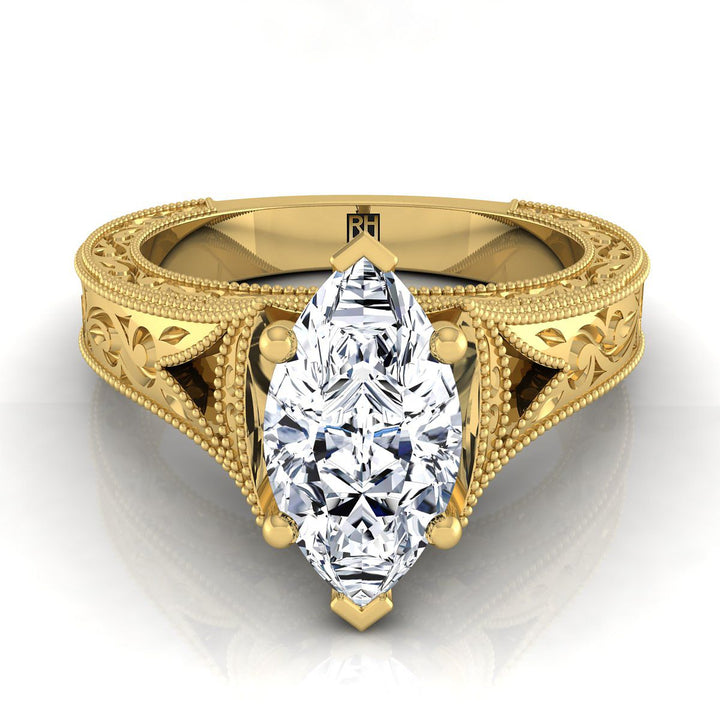 ความสง่างามที่เรียบง่าย แหวนหมั้นเพชรมาร์คีส์นี้ในทองคำเหลือง 18 กะรัต แสดงให้เห็นถึงการออกแบบสลักที่ได้รับแรงบันดาลใจจากโบราณพร้อมด้วยการตกแต่งมิลเกรนแบบคลาสสิก