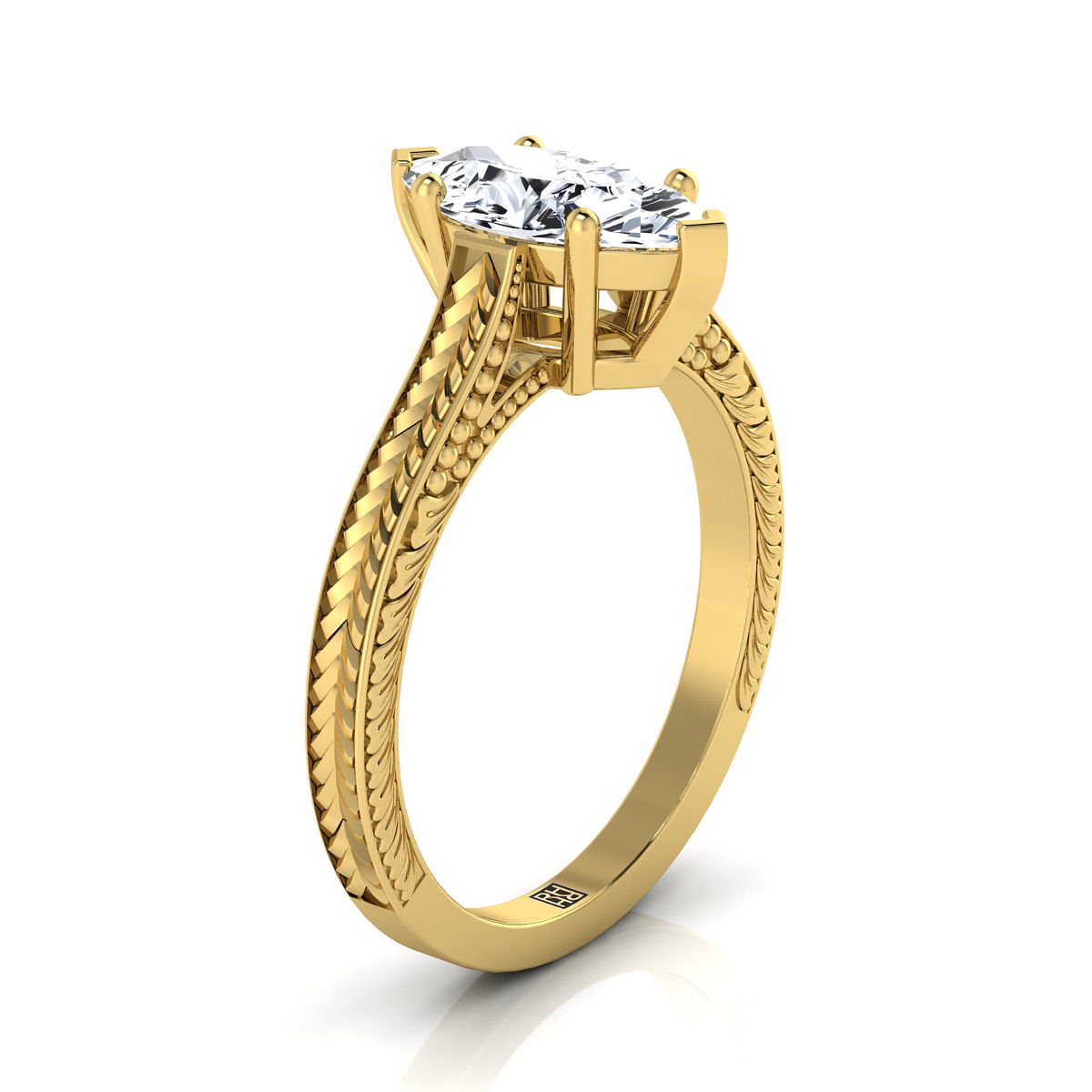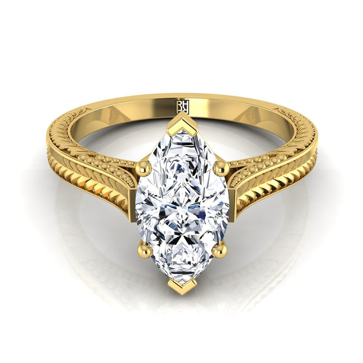 ความสง่างามที่เรียบง่าย แหวนหมั้นเพชรมาร์คีสนี้นำเสนอการออกแบบสลักลายที่ได้รับแรงบันดาลใจจากโบราณ พร้อมการตกแต่งมิลเกรนคลาสสิกในทองคำเหลือง 18 กะรัต