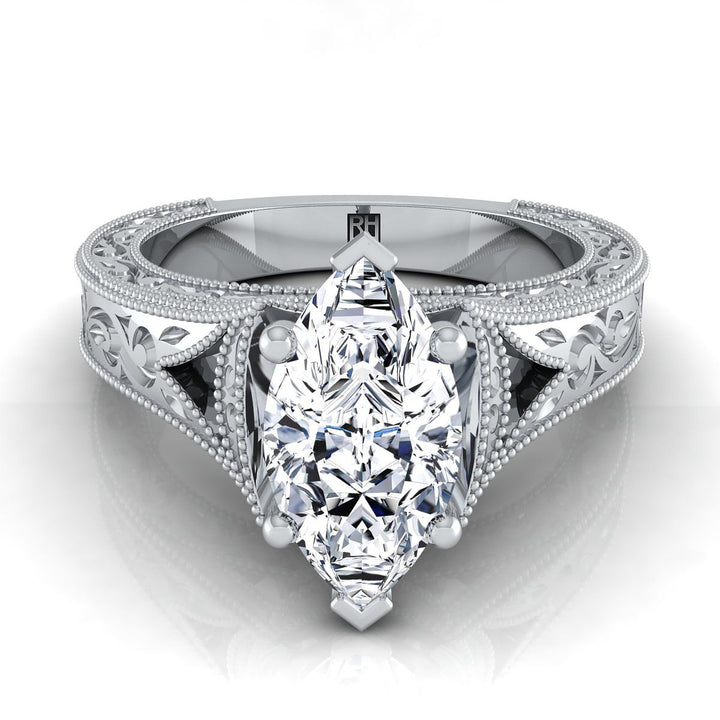 ความสง่างามที่เรียบง่าย แหวนหมั้นเพชรมาร์คีสนี้ในแพลทินัมแสดงให้เห็นถึงการออกแบบสลักที่ได้รับแรงบันดาลใจจากโบราณพร้อมกับการตกแต่งขอบแบบมิลเกรนคลาสสิก