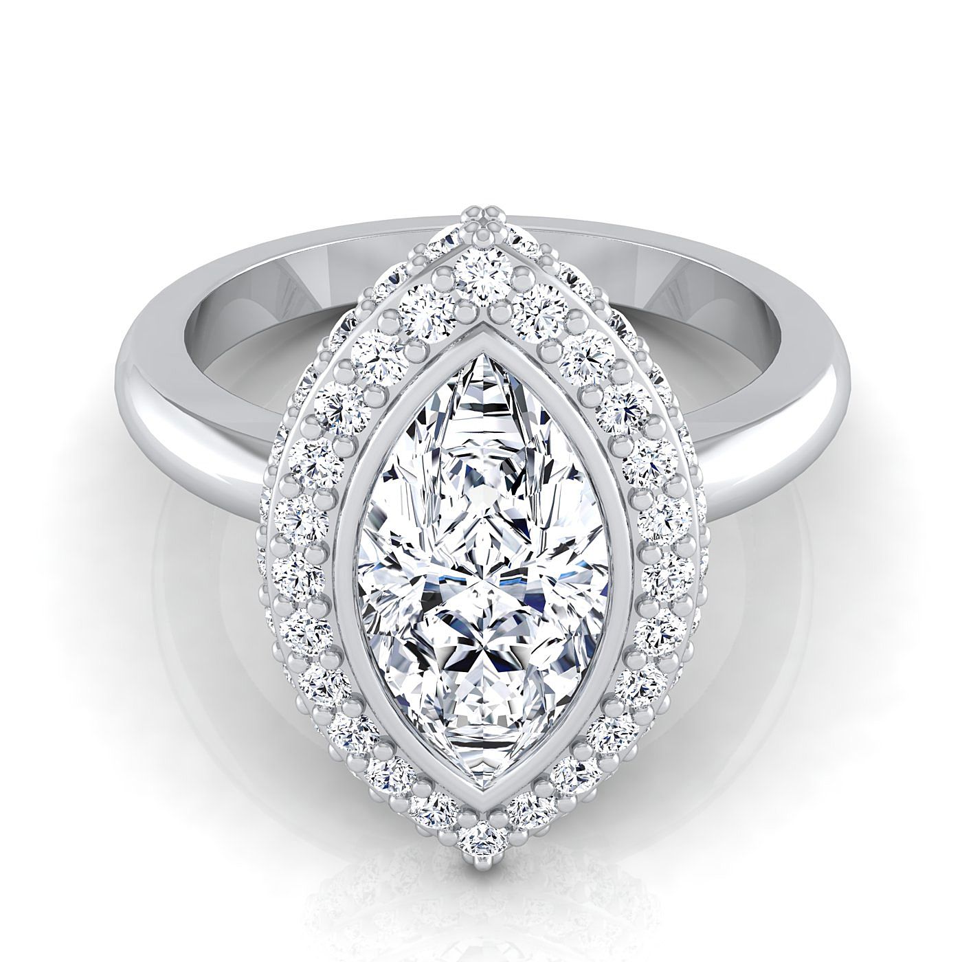 แหวนหมั้นเดี่ยว 14K ทองคำขาว รูปมาร์คีส์ ขอบเบเซล ปาเว่ 3D ฮาโล
