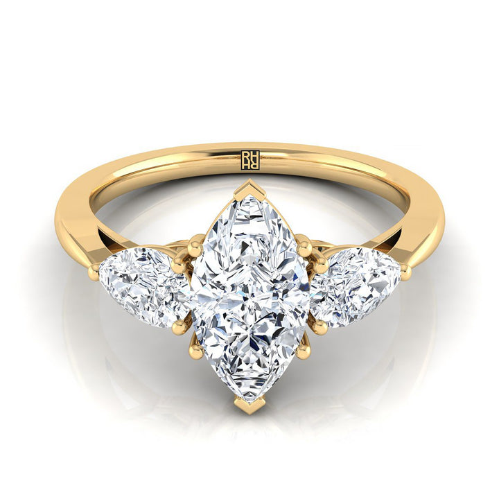 แหวนหมั้นเพชรสามเม็ดรูปทรงลูกแพร์ที่เข้าคู่กันอย่างสมบูรณ์แบบ ประดับด้วยเพชรทรงมาร์คีส์ ทองคำเหลือง 18K - 7/8 กะรัตรวม