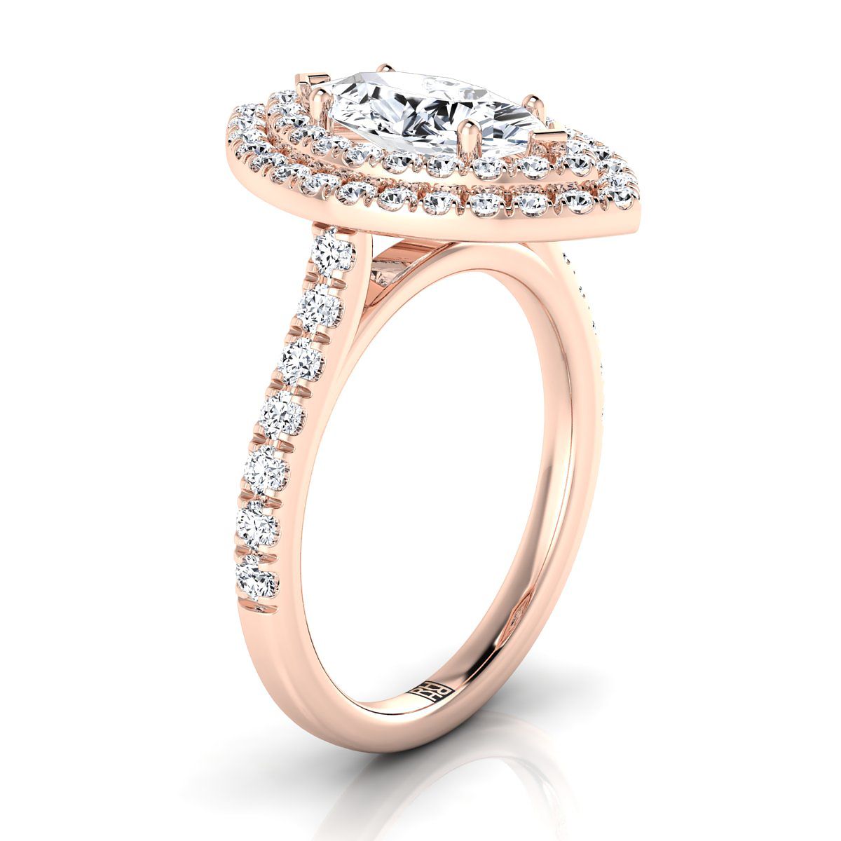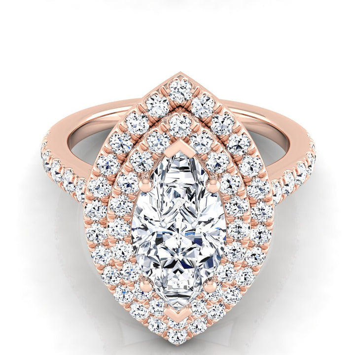 แหวนหมั้นเพชร 14K สีโรสโกลด์ รูปมาร์คีส แบบดับเบิลพาเว่ ฮาโล่ พร้อมเพชรลินีเยอร์ -7/8ctw