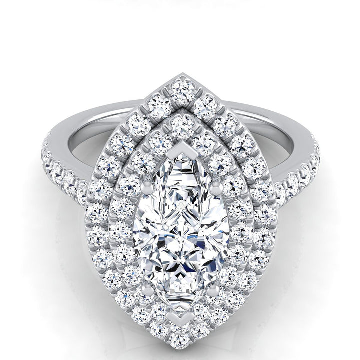 แหวนหมั้นเพชร 14K ทองคำขาวรูปมาร์คีส์ พร้อมฮาโลคู่แบบปาเว่และเพชรเส้นตรง - 7/8 กะรัตรวม
