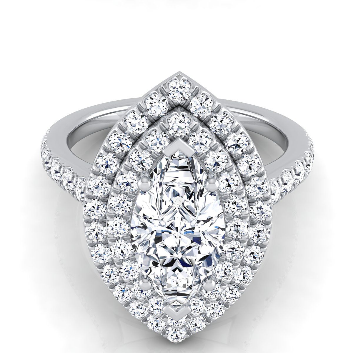 แหวนหมั้นเพชร 18K ทองคำขาวรูปมาร์คีส์ พร้อมฮาโลคู่แบบปาเว่และเพชรเส้นตรง - 7/8ctw