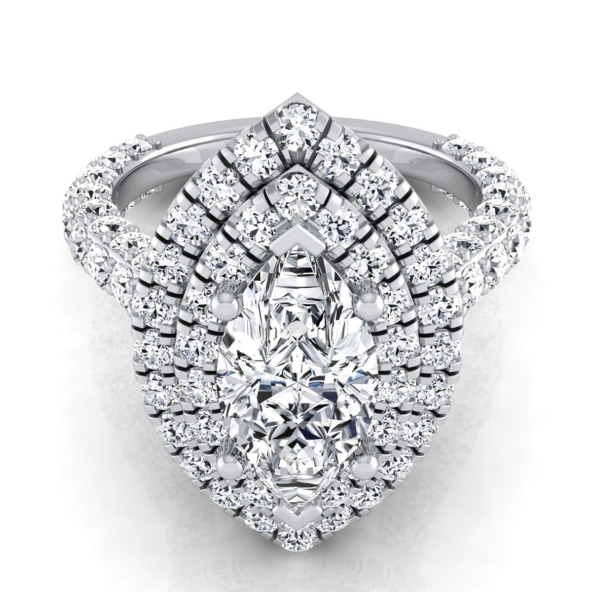 แหวนหมั้นทองคำขาว 14K ทรงมาร์คีส์ เพชรหนาและหรูหราพร้อมฮาโลคู่แบบฝรั่งเศสปาเว่ - 2ctw