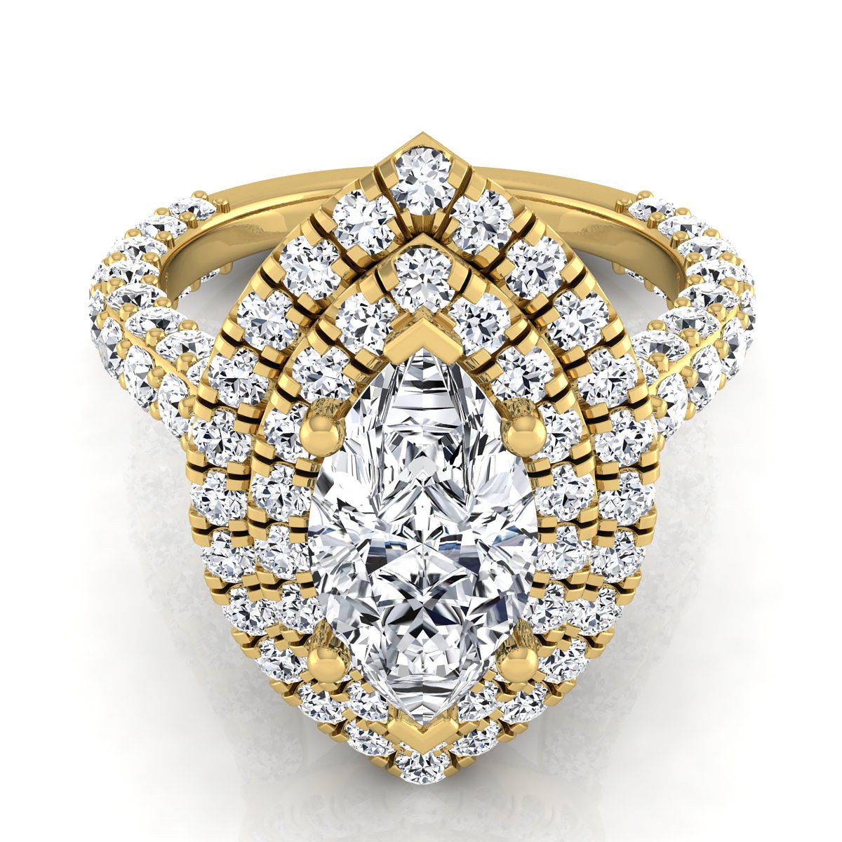 แหวนหมั้นทองคำเหลือง 18K ทรงมาร์คีส์ ประดับเพชรหนาและหรูหราพร้อมฮาโลคู่แบบฝรั่งเศสปาเว่ - 2 กะรัตรวม