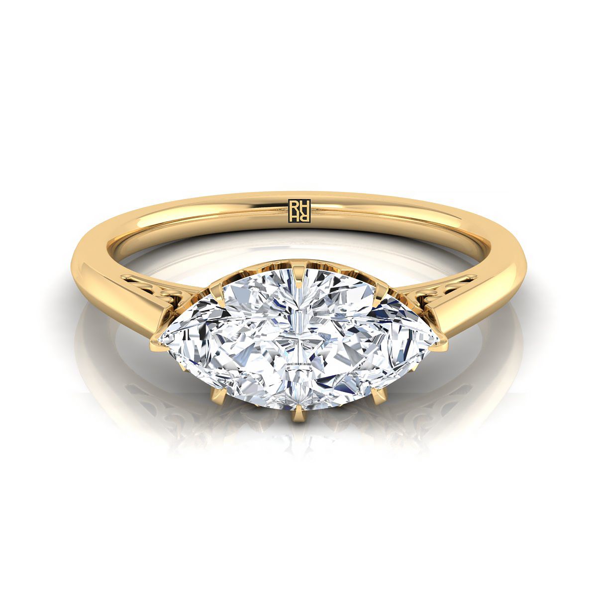 คลาสสิกและสง่างาม แหวนหมั้นเพชรมาร์คีส (ทิศตะวันออก-ตะวันตก) นี้มาพร้อมกับแถบแกลเลอรีแบบม้วนในทองคำ 18 กะรัตสีเหลือง