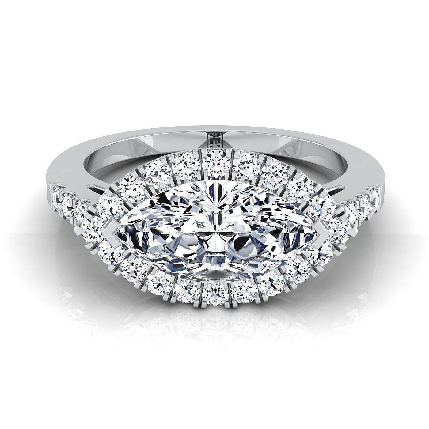 แหวนหมั้นเพชรทรงมาร์คีส์สีขาว 18K แบบแนวนอน ดีไซน์แฟนซีอีสต์เวสต์ ฮาโล