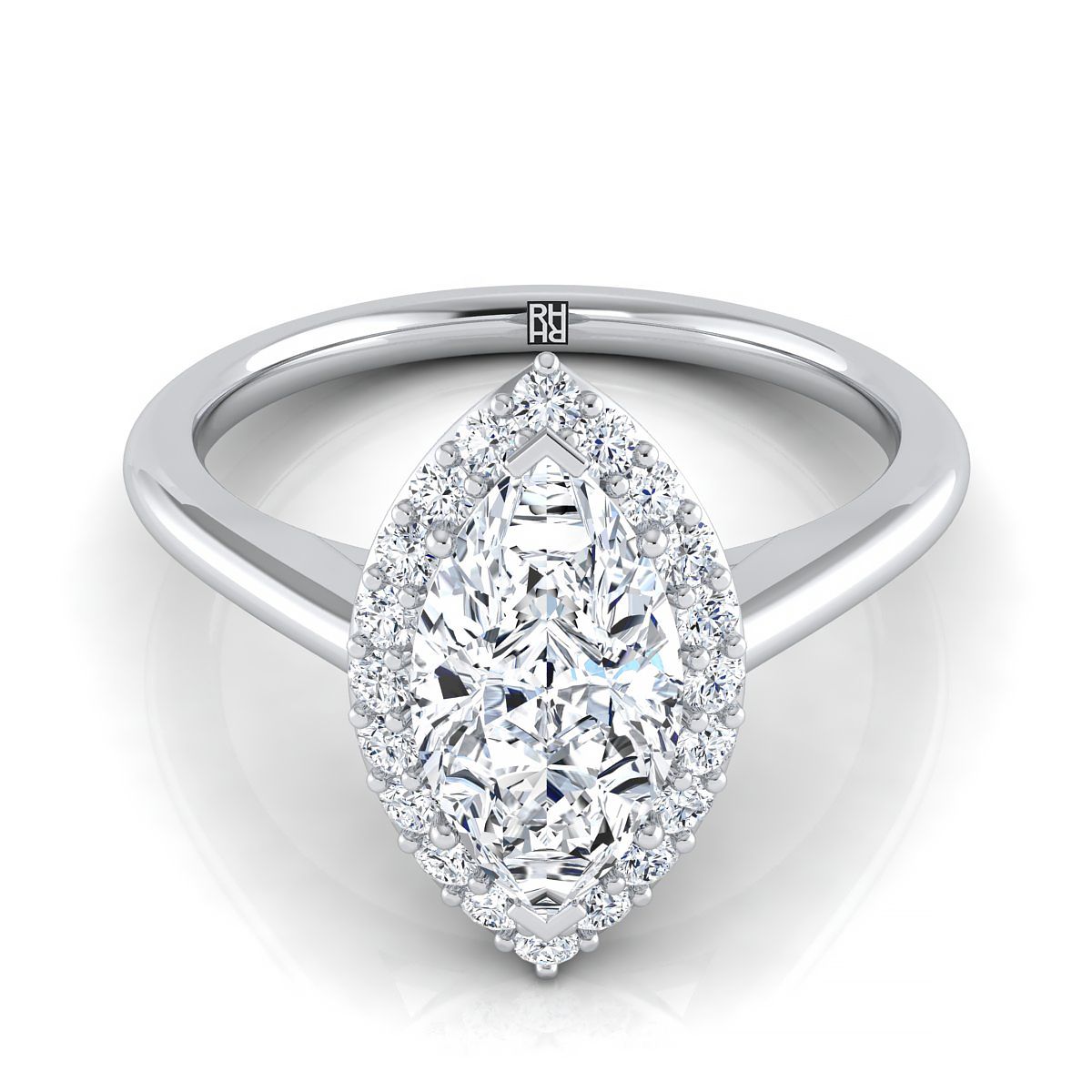แสดงสไตล์คลาสสิก แหวนหมั้นมาควีนฮาโลว์พาเว่ชิ้นนี้นำเสนอเพชรเจียระไนแบบบริลเลียนต์คัท (h-i/vs 0.25 Ctw) ที่ประดับอย่างสวยงามในตัวเรือนทองคำขาว 18 กะรัตแบบคลาสสิก