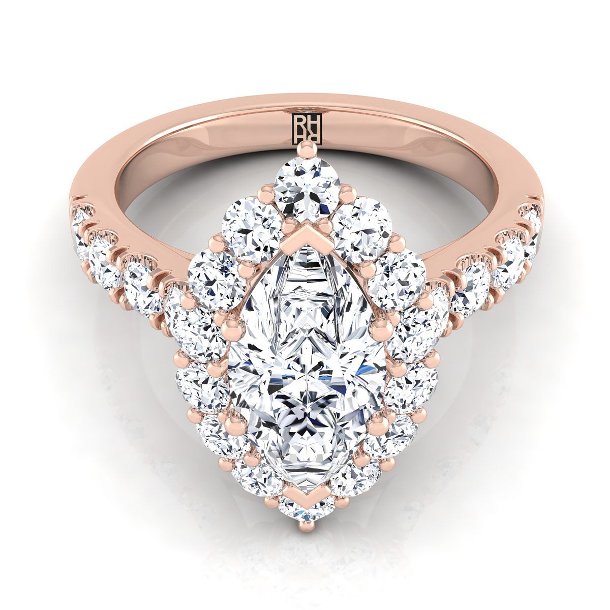 แหวนหมั้นสไตล์หรูหราฝรั่งเศสเพชรพาเว่ฮาโล 14K สีทองกุหลาบรูปมาร์คีส -1-1/10ctw