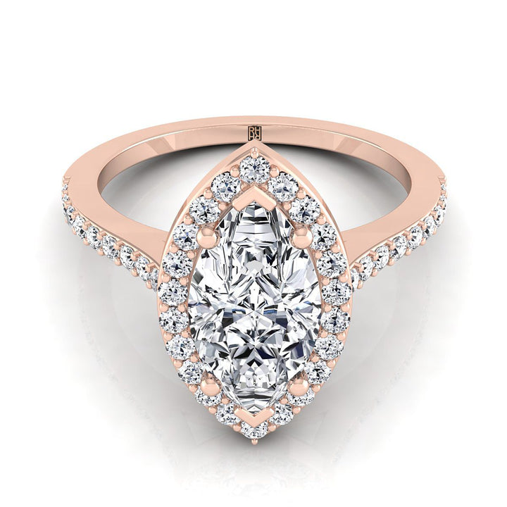แถลงการณ์ที่สง่างามของสไตล์ แหวนหมั้นแบบมาร์คีสฮาโล่ปูเพชรนี้แสดงให้เห็นถึงเพชรที่ตัดอย่างยอดเยี่ยม (h-i/vs 0.33ctw) ที่ตั้งอยู่ในทองคำกุหลาบ 14k แบบคลาสสิกอย่างสวยงาม
