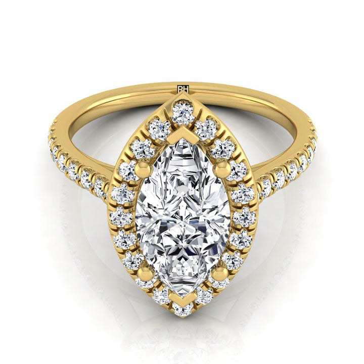 แหวนหมั้นทองคำเหลือง 18K ทรงมาร์คีส์ คลาสสิกฝรั่งเศสแบบปาเว่ ฮาโลและเส้นตรง - 1/2ctw