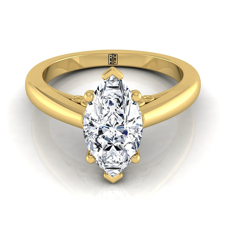 ความสง่างามที่เรียบง่าย แหวนหมั้นเพชรรูปมาร์คีส์นี้แสดงให้เห็นถึงแกลเลอรีการแกะสลักลายม้วนด้วยการขัดเงาคลาสสิกสูงในทองคำเหลือง 14 กะรัต