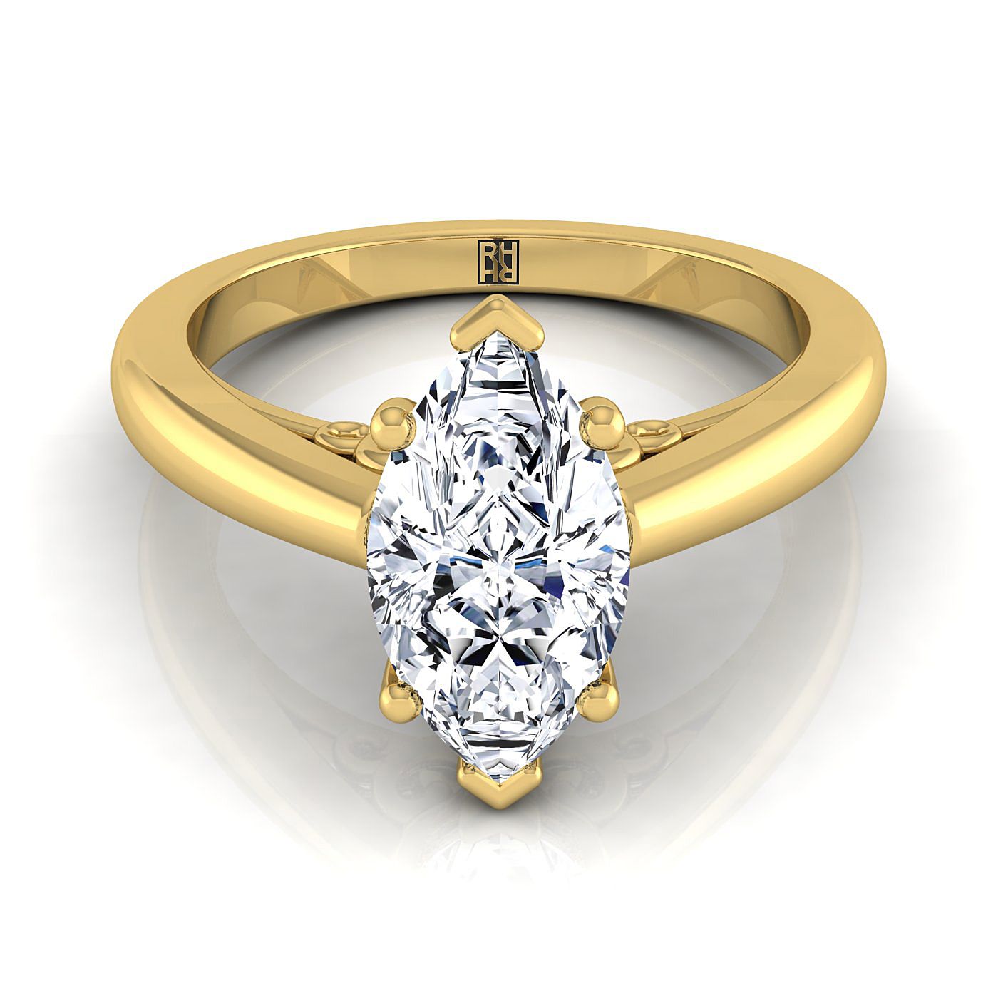 ความสง่างามที่เรียบง่าย แหวนหมั้นเพชรรูปทรงมาร์คีส์นี้แสดงให้เห็นถึงการแกะสลักลายม้วนด้วยการตกแต่งแบบคลาสสิกที่มีผิวมันเงาสูงในทองคำ 18 กะรัตสีเหลือง