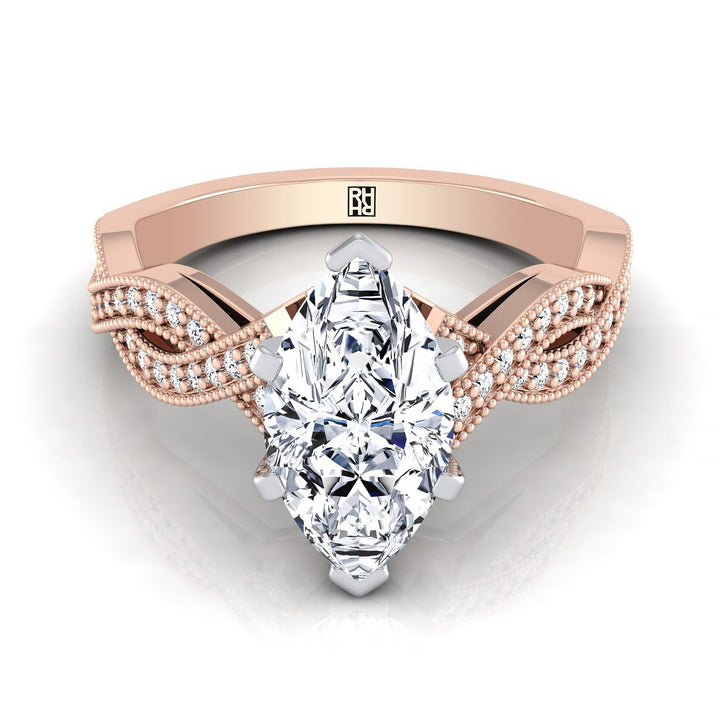 แหวนหมั้นรูปมาร์คีสที่มีเสน่ห์พร้อมแถบมิลเกรนสไตล์อินฟินิตี้ที่ประดับด้วยเพชรกลมสวยงาม (h-i/vs 0.20ctw) ตั้งอยู่ในทองคำกุหลาบ 14k