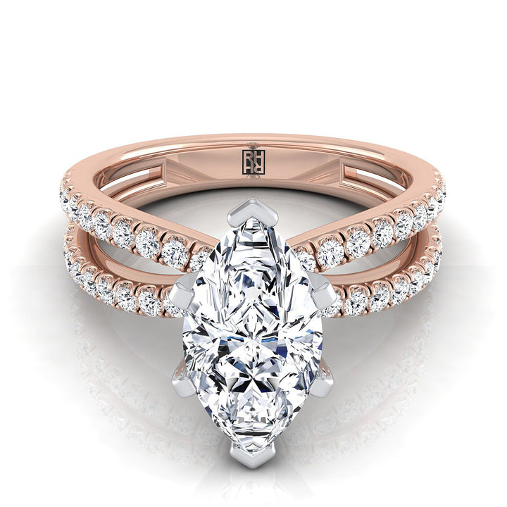 แหวนหมั้นทองคำชมพู 14K เพชรทรงมาร์คีส 2 แถว ปาเว่ แยกขา -1/3ctw