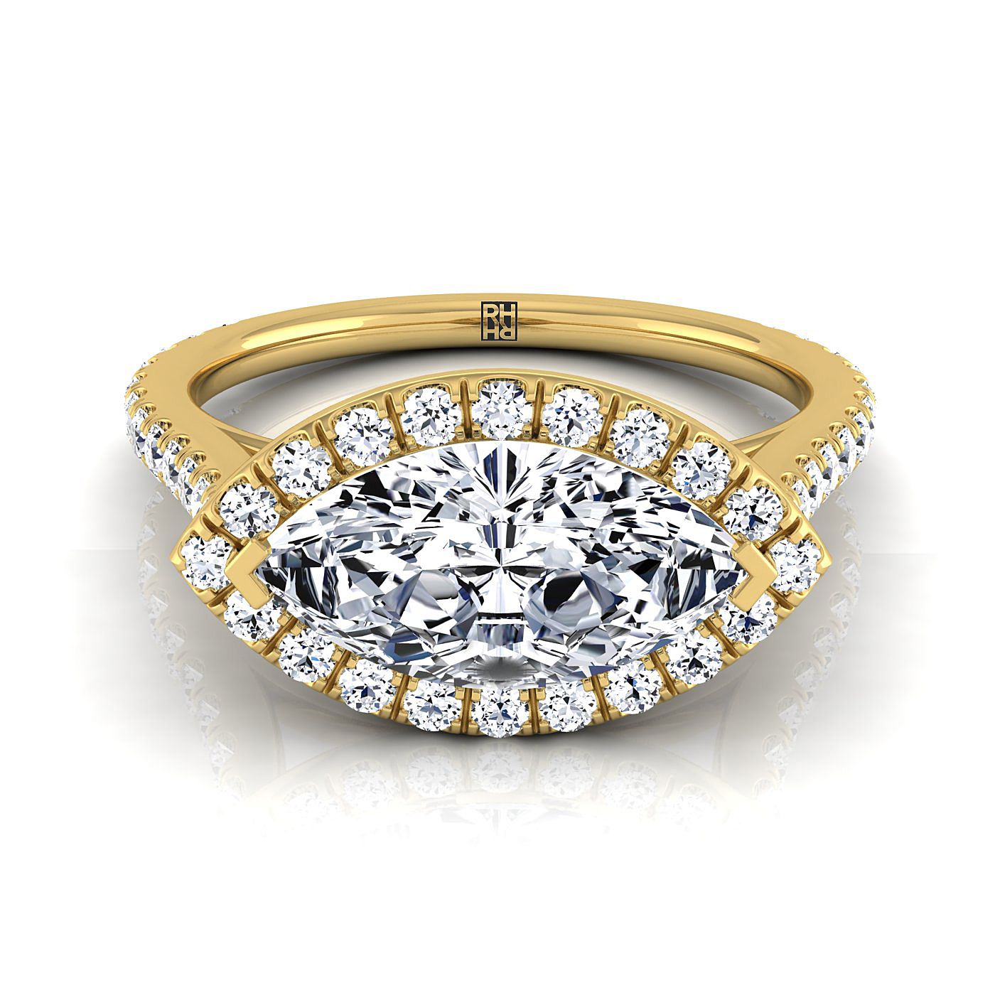 แหวนหมั้นทองคำเหลือง 18K รูปมาร์คีส์ เพชรแนวนอน ดีไซน์แฟนซี อีสต์ เวสต์ ฮาโล - 1/2 กะรัตรวม