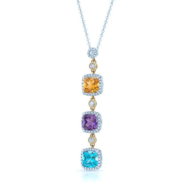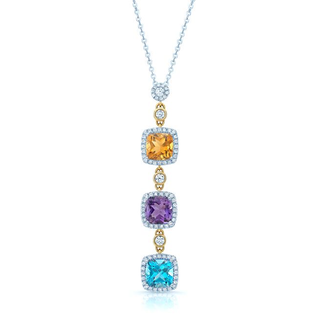 จี้สองโทน 14k พร้อมอัญมณีคิวชันคัทซิทริน, อเมทิสต์ และบลูโทแพซ ขนาด 8 มม. แต่ละเม็ด และเพชรทรงกลมเจียระไนแบบบริลเลียนต์ 84 เม็ด น้ำหนักรวม 0.92 กะรัต บนสายเคเบิลยาว 16 นิ้ว