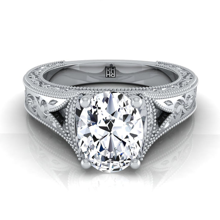 ความสง่างามที่เรียบง่าย แหวนหมั้นรูปไข่เพชรนี้ในแพลทินัมแสดงให้เห็นถึงการออกแบบสลักที่ได้รับแรงบันดาลใจจากโบราณพร้อมกับการตกแต่งขอบแบบมิลเกรนคลาสสิก