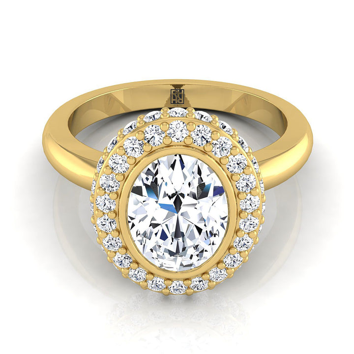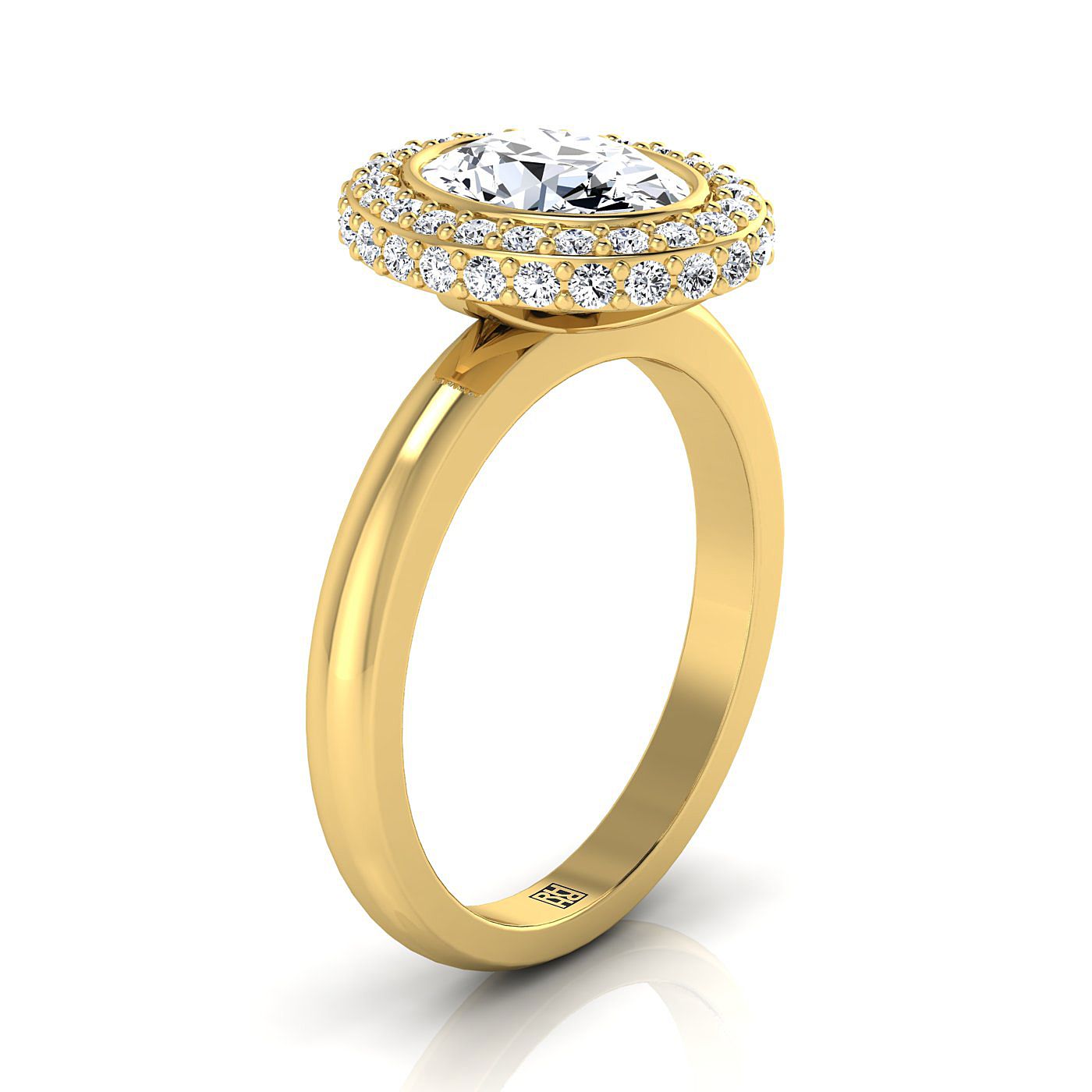 แหวนหมั้นเดี่ยวแบบโซลิแทร์ทรงวงรี 3D ฮาโล่ ประดับเพชรแบบปาเว่ ขอบตัวเรือนทองคำเหลือง 14K