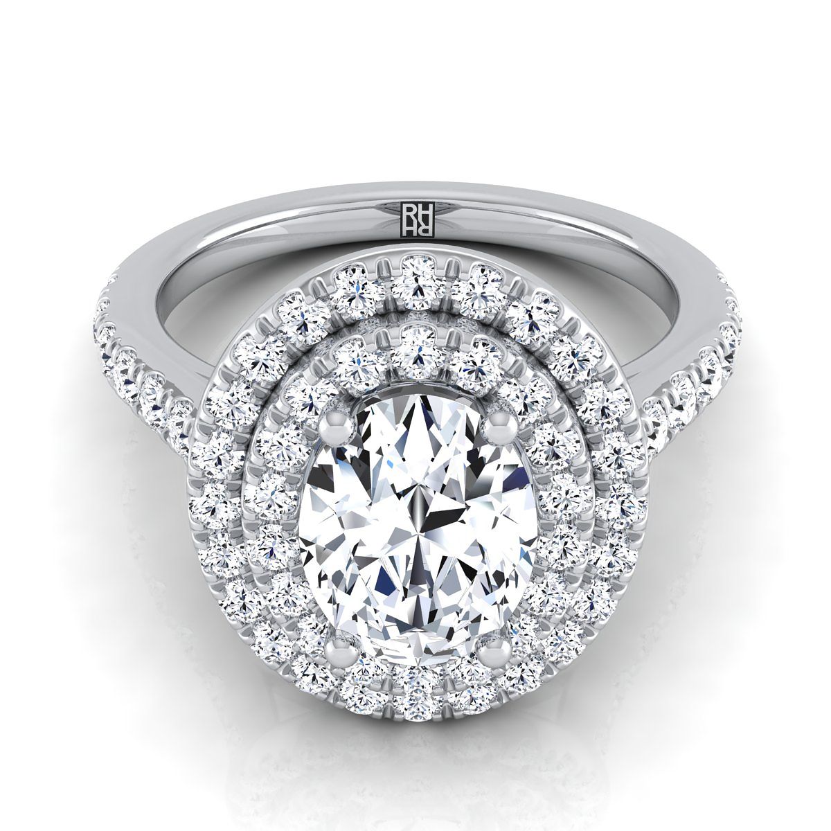 แหวนหมั้นเพชร 18K ทองคำขาวรูปวงรีแบบดับเบิลเพฟ ฮาโล่ พร้อมเพชรเส้นตรง - 7/8ctw