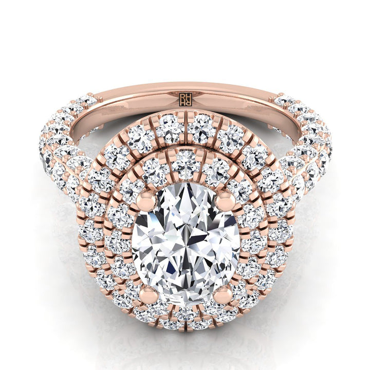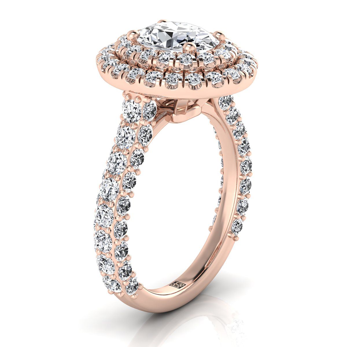 แหวนหมั้นทองคำชมพู 14K รูปไข่ ประดับเพชรหนาและหรูหราพร้อมฮาโลคู่แบบฝรั่งเศสปาเว่ - 2ctw