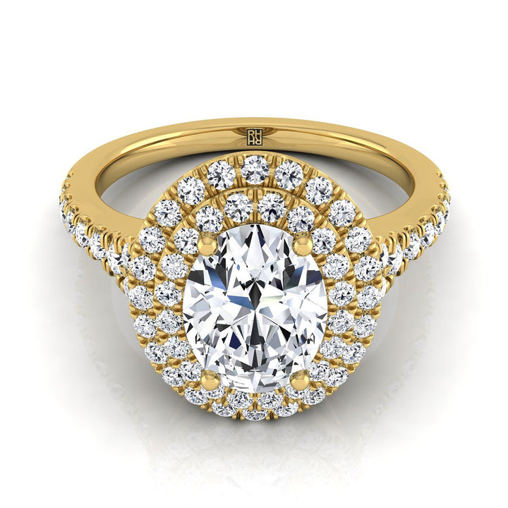 แสดงออกถึงสไตล์ที่สง่างาม แหวนหมั้นรูปไข่แบบดับเบิลฮาโลที่ประดับด้วยเพชรเจียระไนแบบบริลเลียนต์ (h-i/vs 0.55ctw) พร้อมกับแถบเพฟที่ประณีต ติดตั้งในตัวเรือนทองคำเหลือง 14 กะรัต