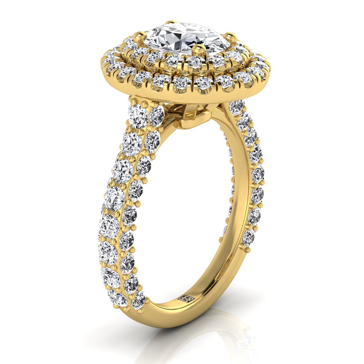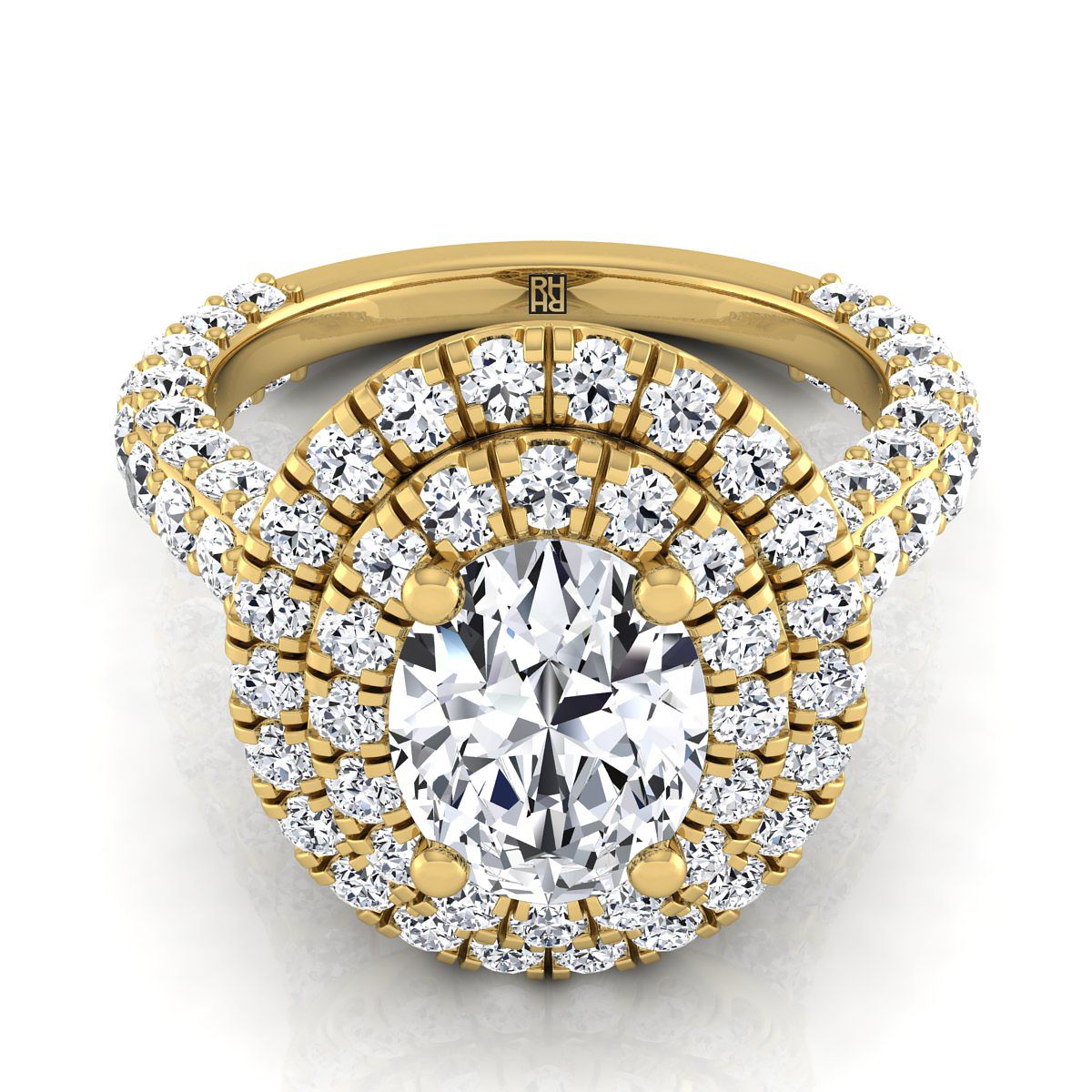 แถลงการณ์สไตล์ที่สง่างาม แหวนหมั้นแบบวงแหวนคู่รูปวงรีนี้แสดงให้เห็นเพชรเจียระไนแบบ Brilliant Cut (h-i/vs 2.15ctw) พร้อมกับแถบเพชรแบบ Pave ที่ประณีต ติดตั้งในตัวเรือนทองคำเหลือง 14k