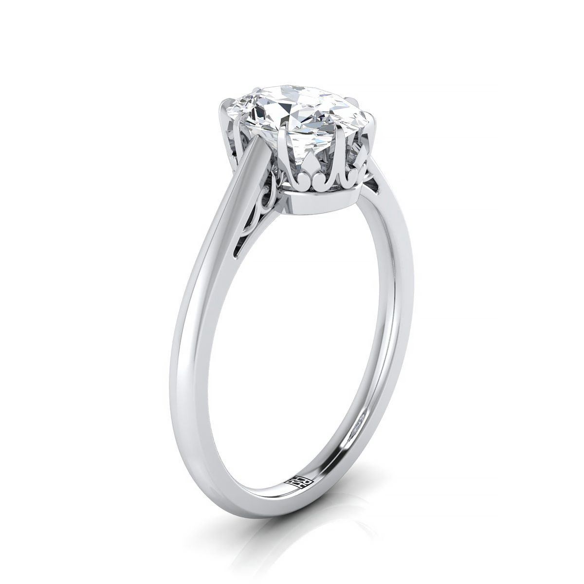 คลาสสิกและสง่างาม แหวนหมั้นเพชรรูปไข่ (แนวตะวันออก-ตะวันตก) นี้มาพร้อมกับแถบแกลเลอรีแบบม้วนในทองคำขาว 14 กะรัต