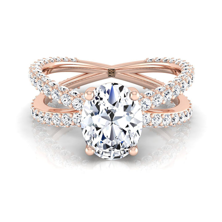 แหวนหมั้นโรสโกลด์ 14K รูปไข่ ประดับเพชรแบบปูแถวไขว้ 1-1/3 กะรัตรวม