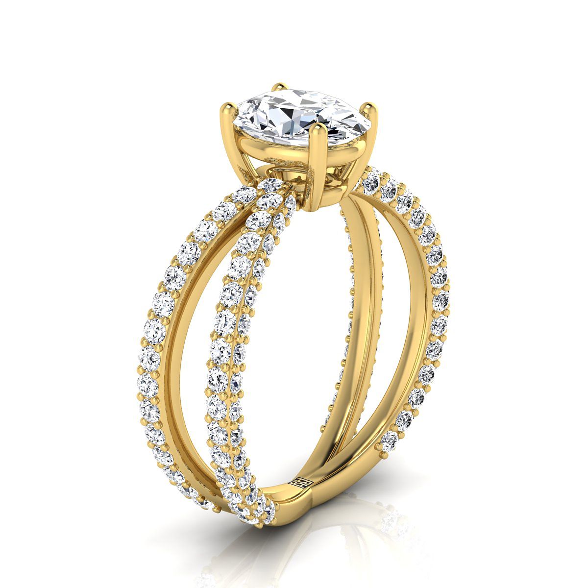 แหวนหมั้นทองคำเหลือง 18K รูปวงรี ประดับเพชรแบบเปิดและปาเว่ไขว้ -1-1/3ctw