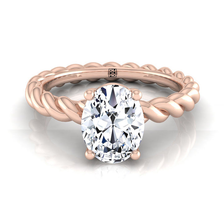 ความสง่างามที่เรียบง่าย แหวนหมั้นเพชรนี้นำเสนอเพชรรูปไข่เดี่ยวพร้อมดีไซน์เชือกที่ก้านแหวนในตัวเรือนทองกุหลาบ 14 กะรัตคลาสสิก